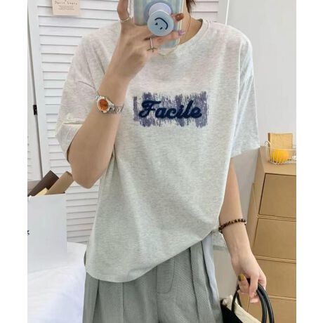 胸元のロゴ風プリントがワンポイントになったカジュアルTシャツ。大きめのシルエットでラフに着られ、抜け感のあるスタイルに仕上がります。