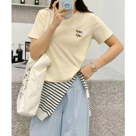胸元にちょこんとあしらわれた犬の刺繍が、シンプルなデザインにほっこりとしたアクセントを添えるTシャツ。カジュアルながら遊び心ある1枚です。