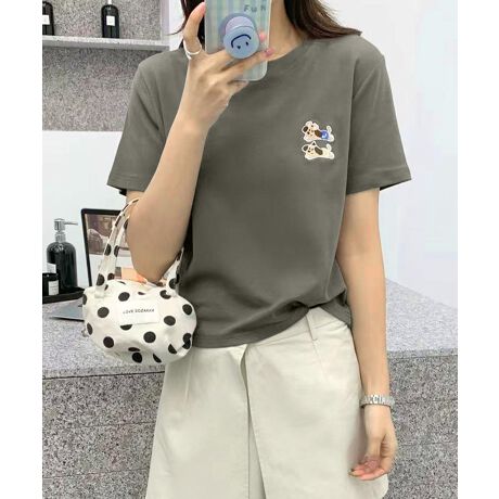 胸元にちょこんとあしらわれた犬の刺繍が、シンプルなデザインにほっこりとしたアクセントを添えるTシャツ。カジュアルながら遊び心ある1枚です。