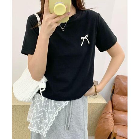 胸元のリボンがポイントのTシャツです。シンプルながらもさりげない可愛らしさをプラスしてくれるデザイン。