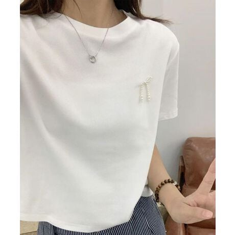 胸元のリボンがポイントのTシャツです。シンプルながらもさりげない可愛らしさをプラスしてくれるデザイン。
