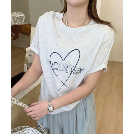 シンプルなハートのプリントが目を引くクルーネックTシャツ。柔らかく快適な素材感と、ゆったりとしたシルエットで、リラックスした着心地が特徴です。