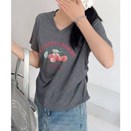 キュートなチェリープリントが目を引くVネックTシャツ。首元をすっきり見せるVネックデザインで、着?せ効果も抜群です!