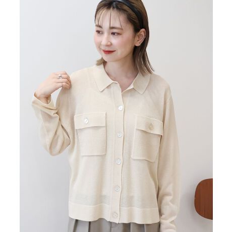 細かいラメを纏ったシアーなニット生地で上品に仕立てたカーディガン。きちんと感のある襟付きに、大きなダブルポケットが目を惹くポイントです。程よい透け感と軽い着心地で、夏の羽織りアイテムにぴったり。