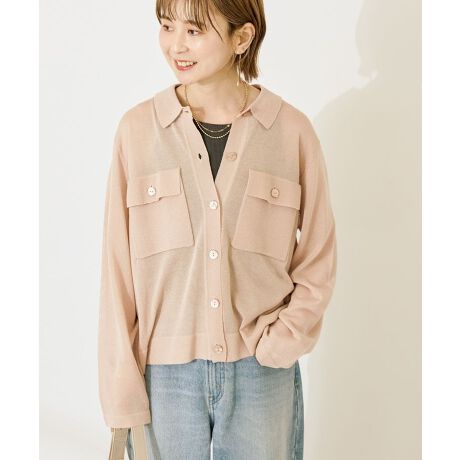 細かいラメを纏ったシアーなニット生地で上品に仕立てたカーディガン。きちんと感のある襟付きに、大きなダブルポケットが目を惹くポイントです。程よい透け感と軽い着心地で、夏の羽織りアイテムにぴったり。