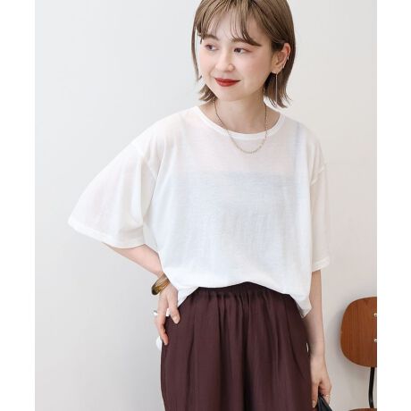 柔らかな肌触りのコットンベース素材で仕立てたシアーTシャツ。身幅を持たせたボックスシルエットが身体のラインを拾いすぎず、程よく上品な抜け感を演出します。落ち着いたデザインで、日常使いからセミフォーマルシーンまで対応。タックアウトしたスタイルはもちろん、軽くインしてニュアンスを付けたスタイルもおすすめ。