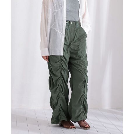 配色ステッチが目を惹くパンツ。カーゴライクなディテール×たっぷりギャザーの女性らしいデザインが華やかな一枚です。ウエストと裾のドロストコードでシルエットを調整できるのも嬉しいポイント。シンプルなトップスに合わせるだけでスタイリングが完成するおすすめのアイテムです。透け感[なし]