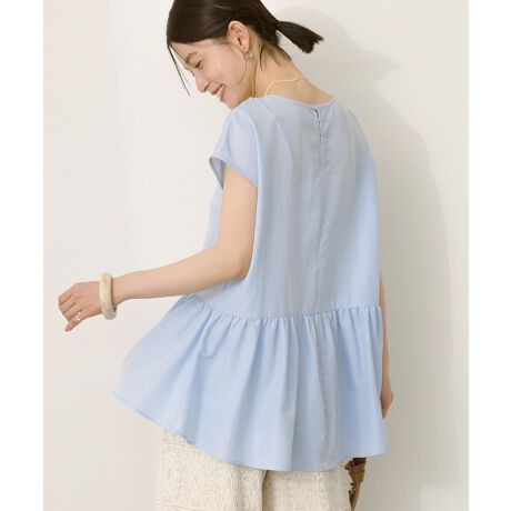 肌触りのさらりとした素材で仕立てたデザインブラウス。ギャザーたっぷりに切り替えたペプラムシルエットがさりげなく身体のラインをカバーして、スタイルアップ効果も期待できます。ラウンドヘムがすっきりとしたスタイリングを演出。背中の小粒クリアボタンが抜け感をプラスして、デイリーに活躍するおすすめのアイテムです。