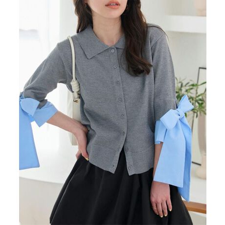 5分袖のカーディガンからシャツ袖をのぞかせたレイヤード風デザインが印象的で洗練された一着。
