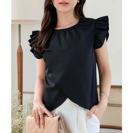 すっきりとした身頃に肩のフリルデザインが気になる腕周りもさりげなくカバー。