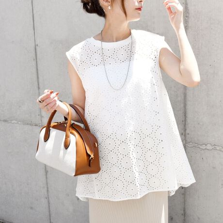 花柄のカットワーク刺繍が華やかなノースリーブブラウス。