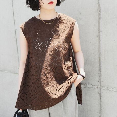 花柄のカットワーク刺繍が華やかなノースリーブブラウス。
