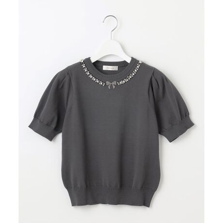 襟元にきらめくビジューデザインが可愛いニットプルオーバー