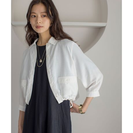 【スタッフコメント】▼身長158cm|着用サイズ2 (通常着用サイズM)さらっとした素材感なので夏の冷房対策にもおすすめなジャケットです。裾を絞ることで今っぽいスタイリングが叶い、ノースリーブワンピースなどに羽織ることで気になる二の腕隠しにも◎この夏1枚持っておきたい万能アイテムです。