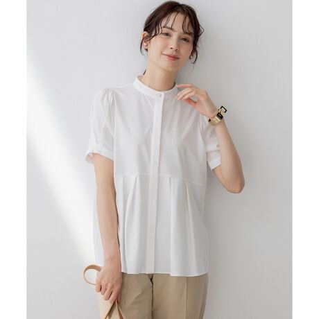 ■デザイン・高めの切り替えからのタックが身体から適度に離れるので着心地も抜群。・5分丈の袖はカフス切り替から重ねタックのボリューム感がレディな印象に。・首元のパール釦がデザインポイント。