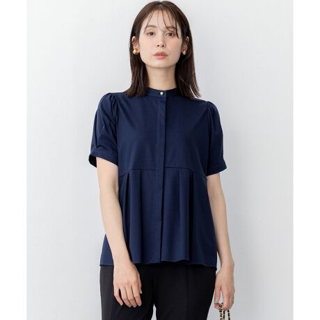 ■デザイン・高めの切り替えからのタックが身体から適度に離れるので着心地も抜群。・5分丈の袖はカフス切り替から重ねタックのボリューム感がレディな印象に。・首元のパール釦がデザインポイント。