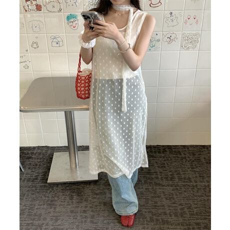 軽やかで遊び心のある印象を与える、ドット柄のシアーワンピース。透け感のあるデザインが季節感を引き立て、シンプルなコーディネートに重ねるだけで、一気にトレンド感あふれるスタイルが完成します。レイヤードで魅せる大人の抜け感コーデにぴったりの一着です。