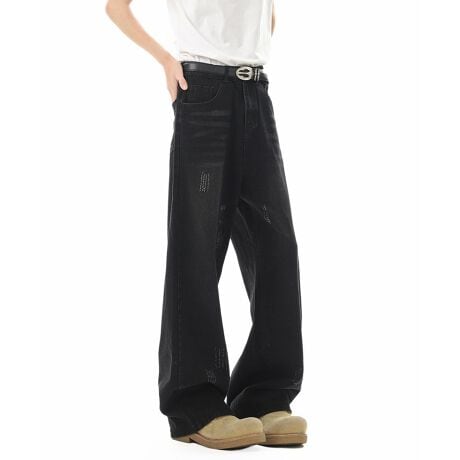 全体的にゆとりのあるストレートなワイドシルエットで、リラックスした穿き心地。ダメージ風の加工や絶妙な色ムラがアクセントとなり、シンプルなトップスとも好相性。股上はやや深めで、タックインしてもスタイルよくまとまります。