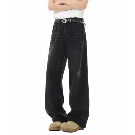 全体的にゆとりのあるストレートなワイドシルエットで、リラックスした穿き心地。ダメージ風の加工や絶妙な色ムラがアクセントとなり、シンプルなトップスとも好相性。股上はやや深めで、タックインしてもスタイルよくまとまります。