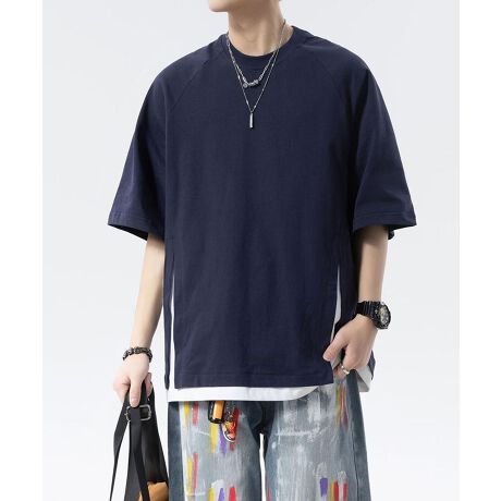 落ち着いたベースカラーに配色切り替えが映える、スポーティTシャツ。裾部分に施されたV字風の切り替えラインが、シンプルな中にもアクセントを加えています。