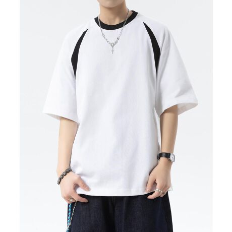 両肩から脇にかけての配色パネルが、上半身のシルエットを立体的に見せ、着るだけで身体のラインがすっきりとした印象に。首元はクルーネック仕様で、清潔感と安定感のあるデザイン。全体的にゆったりとしたシルエットで動きやすく、日常使いにも快適です。