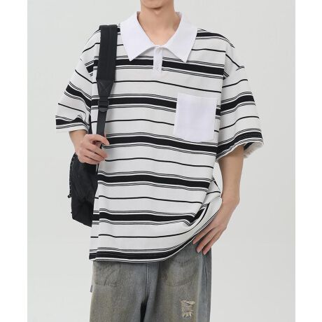 クラシックなボーダー柄に、シャツ風の襟と胸ポケットを組み合わせた一枚。ポロシャツのようなきちんと感を持ちながらも、Tシャツのように気軽に着こなせるデザインで、カジュアルさと上品があります。