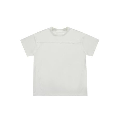 フロントの水平ライン切り替えが特徴的な、ミニマルデザインのTシャツ。装飾を抑えたシンプルな仕上がりながら、さりげないディテールが光る一枚です。日常使いはもちろん、きれいめカジュアルにも馴染む万能アイテムです。
