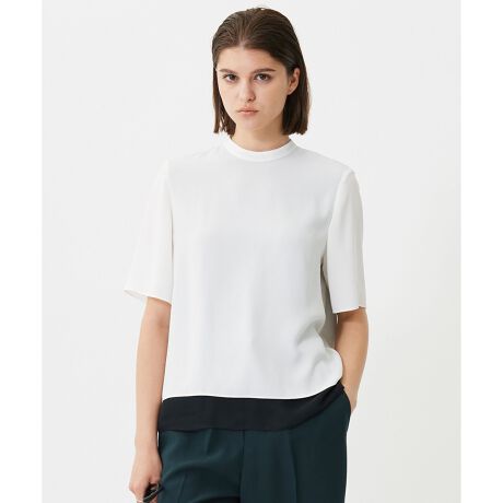 ■デザイン裾部分に薄手の別布シフォンを使用したバイカラーデザインがポイントのブラウスです。程よくゆとりがある五分袖デザインで、普段使いからオフィスシーンまで幅広く活躍します。単品使いはもちろん、ジャケットのインナーとしてもスタイリングに華やかさをプラスするアイテムです。