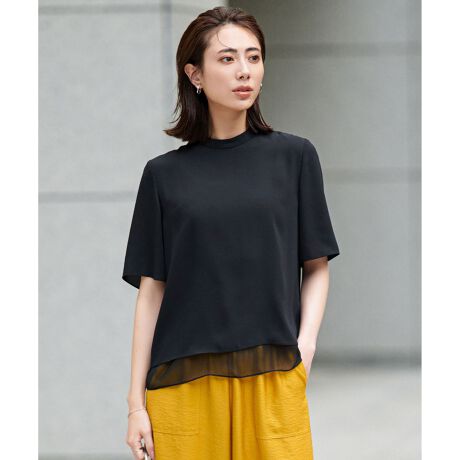 ■デザイン裾部分に薄手の別布シフォンを使用したバイカラーデザインがポイントのブラウスです。程よくゆとりがある五分袖デザインで、普段使いからオフィスシーンまで幅広く活躍します。単品使いはもちろん、ジャケットのインナーとしてもスタイリングに華やかさをプラスするアイテムです。