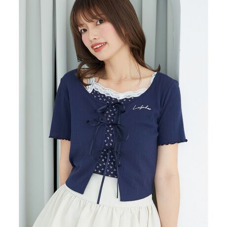 [ネイビー柄]カーディガン:本体/綿100% 刺しゅう糸/ポリエステル100% リボン/ポリエステル100% キャミソール:本体/綿90% ポリウレタン10% チュール/ポリエステル100% レース/ナイロン90
