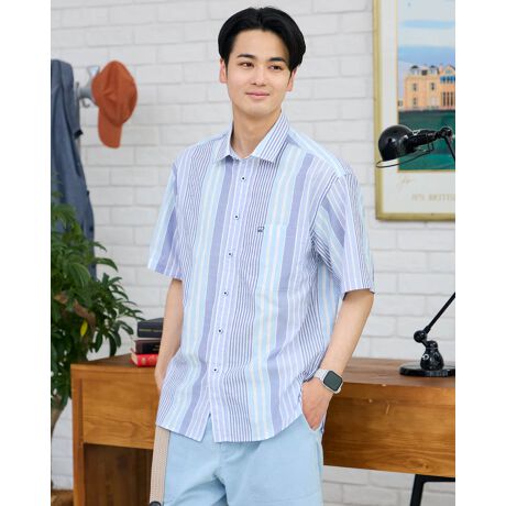 レギュラー襟のマルチストライプシャツです。部分的にサッカー組織で織った生地は、肌離れがよくさらっとした着心地が特徴です。サイズ感もややゆったりとしたリラックスシルエットです。