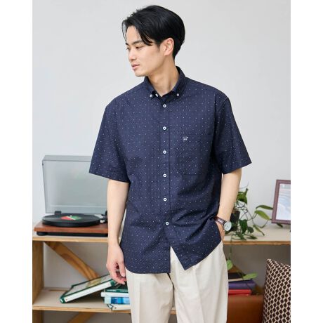 セミワイドボタンダウン襟のドット柄シャツです。表面に凹凸やシボ(シワ模様)を付けるリップル加工を施しています。生地の凹凸により肌に張り付きにくく、さらっとした着心地が特徴です。サイズ感もややゆったりとしたリラックスシルエットです。