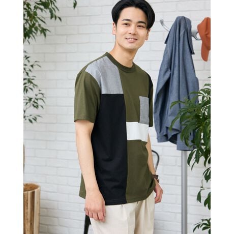 異なる生地で切り替えたクルーネックTシャツです。ダンガリー生地と色の異なる天竺で切り替えました。大胆な切り替えがコーディネートの主役になるTシャツです。