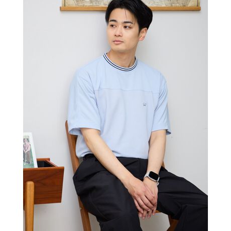 [型番:314R6522]フットボールTをモチーフにしたクルーネックTシャツです。表情のあるボックス鹿の子地とポリエステル鹿の子生地で切り替えました。吸水速乾性に優れており、さらっとした着心地が特徴です。