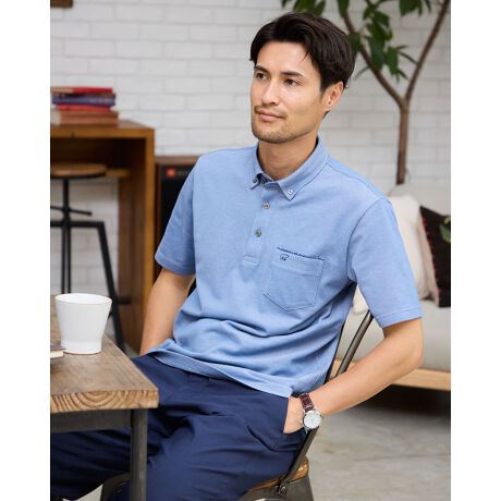 共地ボタンダウン襟のポロシャツです。吸水速乾性に優れたシャンブレー鹿の子生地を使用しています。部分的に小花柄の別布を使用し上品な印象に仕上げました。