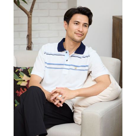 リブ襟のパネルボーダーポロシャツです。吸水速乾性に優れた鹿の子生地を使用しています。すっきりとしたボーダーは派手過ぎず、コーディネートに取り入れやすいアイテムです。