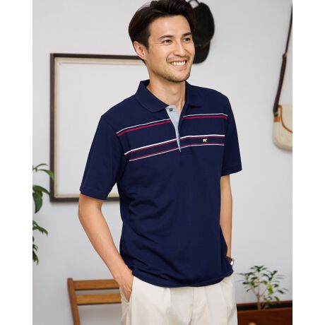 リブ襟のパネルボーダーポロシャツです。吸水速乾性に優れた鹿の子生地を使用しています。すっきりとしたボーダーは派手過ぎず、コーディネートに取り入れやすいアイテムです。