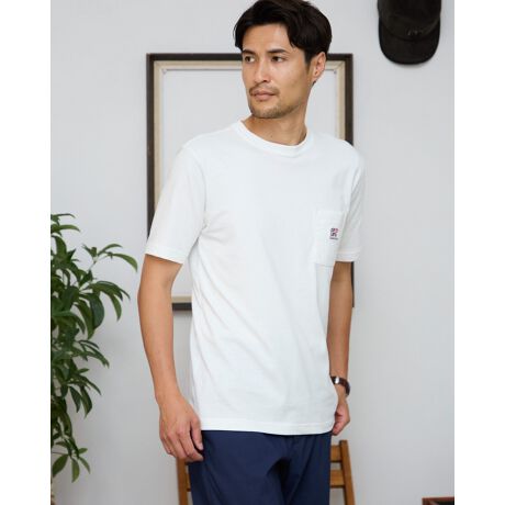 アメリカの星条旗をモチーフにした刺繍を施したクルーネックTシャツです。環境にも肌にも優しいオーガニックコットン100%素材を使用しています。襟ぐりは身頃同色染で強度のあるフライスを使用、バインダー始末にすることでヨレにくさを実現しました。