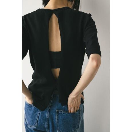 WHT:モデル身長165cm(FREEサイズ着用)BLK,BRN:モデル身長166cm(FREEサイズ着用)程よく肌見せできるバックオープンデザインがヘルシーでモードなニットトップ。フロントはシンプルなデザインで仕上げました。表面は100%綿の細番の強撚糸、裏目にはストレッチ糸を編み込んだドライタッチで程よく張り感のある編み地を使用しているので、身体に張り付きにくく着心地の良い一枚です。透け感ややなし、ストレッチあり。【お手入れ方法】手洗い可