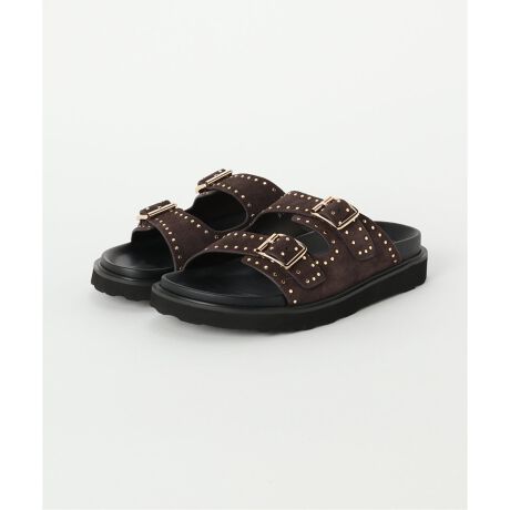 別注にてオーダーしたブラウンスエードのスタッズサンダルはトレンドらしい1足。