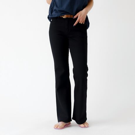 ヒザからスソにかけて広がるフレアシルエットはヒザの絞り位置を高めに設定することで、ヒザ下を長く、さらに脚全体を長く魅せてくれます。