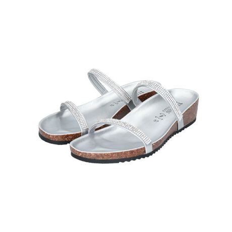 ラインストーンをあしらったキラキラのダブルストラップがカジュアルすぎない「イタリアンシューメーカーズ」のフットベッドサンダル。