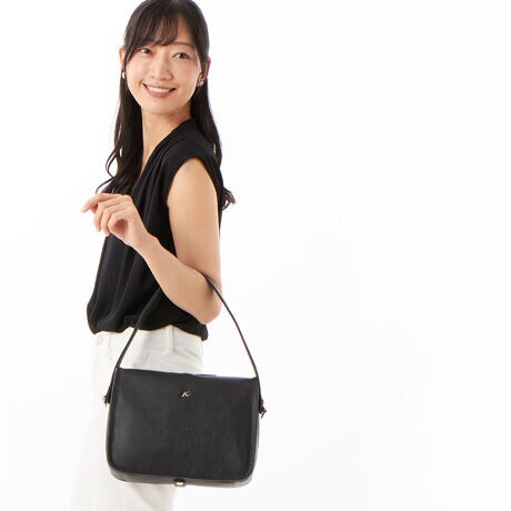 [型番:P-1102]2WAYタイプで使い分けができるセミショルダーバッグ。程よいハリ感と柔軟性を兼ね備えたシュリンク型押し革を採用。斜め掛けとワンハンドルで使い分けができるので、若い世代の方にもおすすめなデザインです。底部にはスナップボタンが付いており、ハンドルを底部に収納するとショルダーバッグ時でもスッキリと持つことができます。おすすめポイント・柔軟性を兼ね備えたシュリンク型押し革・ゴールドの金具がラフ過ぎない印象・2WAYタイプ