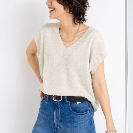 ラメスパンコールノースリーブVネックプルオーバーニット