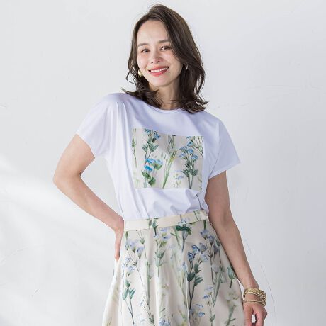 大人のT シャツスタイルにおすすめな、カジュアルになりすぎないフェミニンなプリントT に仕上げました。