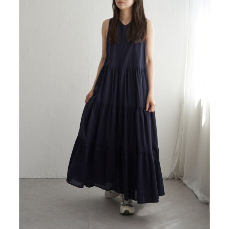 たっぷりティアードのボリューム感と、ノースリーブのすっきり感でバランスの良いワンピース。