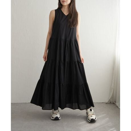 たっぷりティアードのボリューム感と、ノースリーブのすっきり感でバランスの良いワンピース。