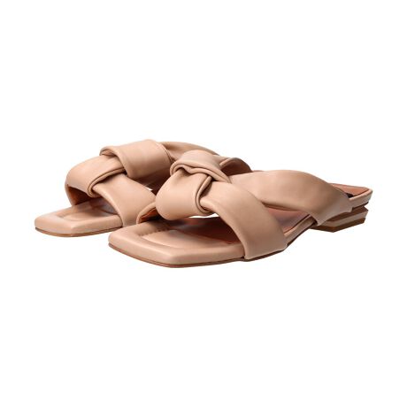 スクエアトウのローヒールノットサンダルは袋状に縫われたアッパーのソフトな質感が特徴的な一足。