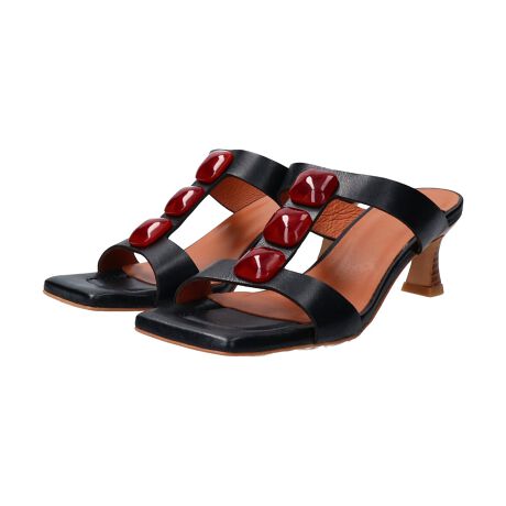 スクエアトウのミュールサンダルは、シンプルなデザインでありながら3連ストーンが目を引く一足。