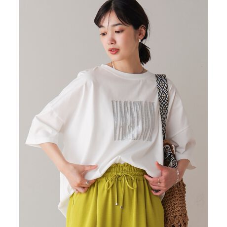 Wシルケット生地を使用した3Dの様な立体ロゴプリントTシャツです。バックスタイルにはグログランテープの配色ラインがポイントに後ろ姿も抜かりないTシャツです。グリッターラメと繊細な箔プリントを重ね合わせることでアートの様な立体感のあるロゴに仕上げました。ロゴが苦手な方にもカジュアル過ぎずおススメです。程良い丈感は重くならないよう、前後をさり気無いカーブでインでもアウトでも決まる設定にパンツでもスカートでも合わせやすいシルエットにしています。